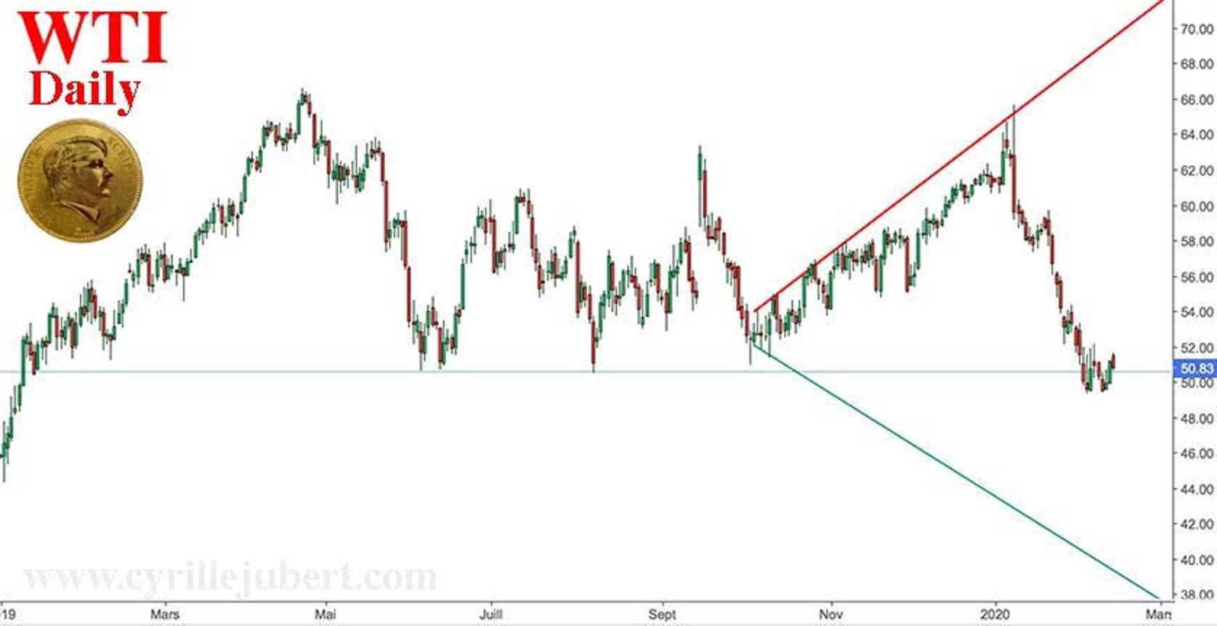 As for oil, it has been clinging desperately for two weeks to the support of $ 50, but this figure in a megaphone shows that it could drop very suddenly below $ 40.