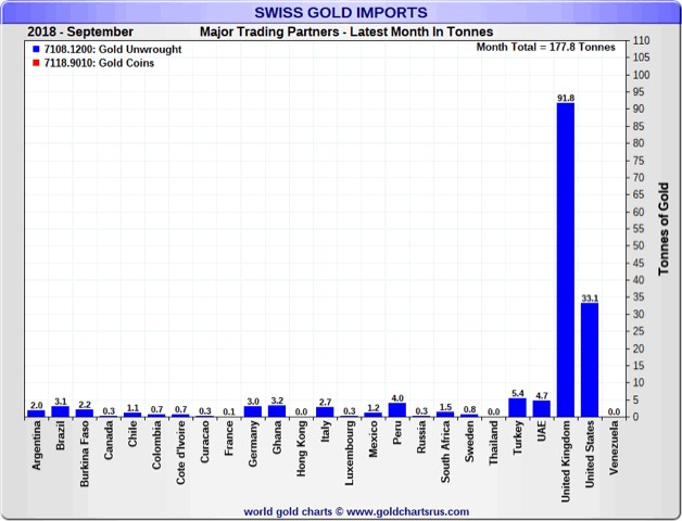 Last month Switzerland imported 92 tonnes of gold from the UK. We know of course that the UK is not a gold producing country. So these are 400 oz bars from UK bullion banks that are bought by Swiss refiners to break down into 1 kg bars and ship to China and India. The majority of the 33 tonnes that came from the US in September is also 400 oz bars from US bullion banks. Most of this UK and US gold is likely to come from central banks.