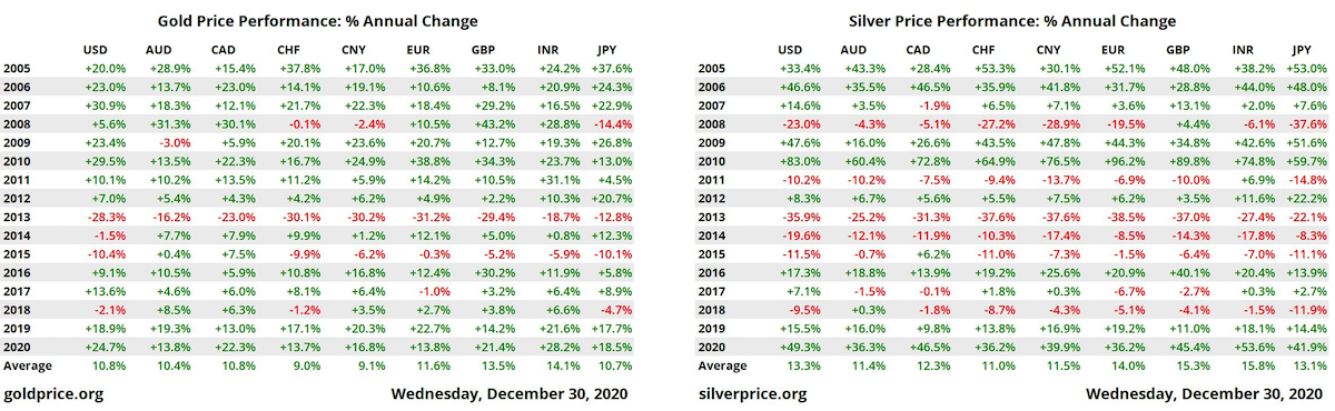 Gold and silver closed out their best years since 2010 following a year of unprecedented volatility brought on by the Covid-19 pandemic.
